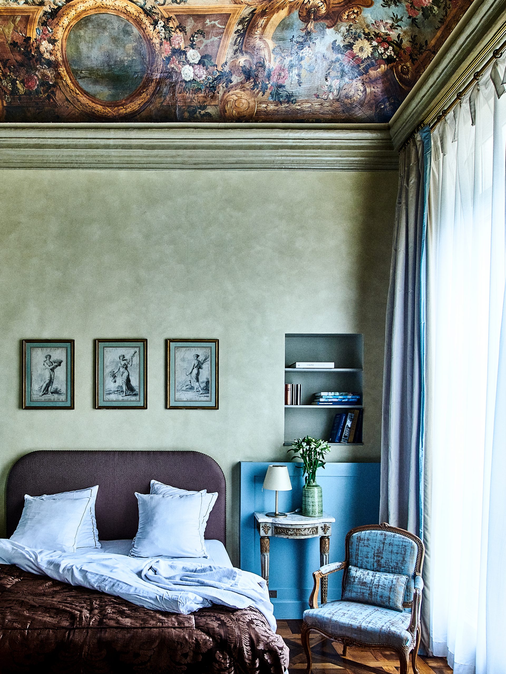 1980. Workers dismantle a false ceiling in room 100. And discover a 17th-century fresco in miraculous condition. An allegorical composition from 1666, commissioned by Pierre Abraham who served at the royal table: a scene where Good Fortune receives his crown from the hands of Virtue, while a figure representing the spirit observes. Experts recognize the Versailles style of the era. This work transforms the room into a private gallery. What could have been mere marketing anecdote reveals the establishment’s philosophy. For nearly three centuries, this fresco remained invisible, protected by oblivion. A metaphor for this hotel that refuses overexposure, cultivates secrecy, prefers substance to spectacle. Each room extends this logic: pictorial works and prints from the Baroque and Enlightenment periods, exposed beams, ornamental relief sculptures. No standardization, no hotel decoration calibrated by an international firm. Just a collection of singular identities, like so many cabinets of curiosities.